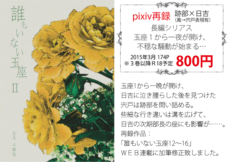 新刊として、「余韻」シリーズの再録本と、「誰もいない玉座Ⅲ」、大正浪漫に絡めた書き下ろし1冊を予定しています。